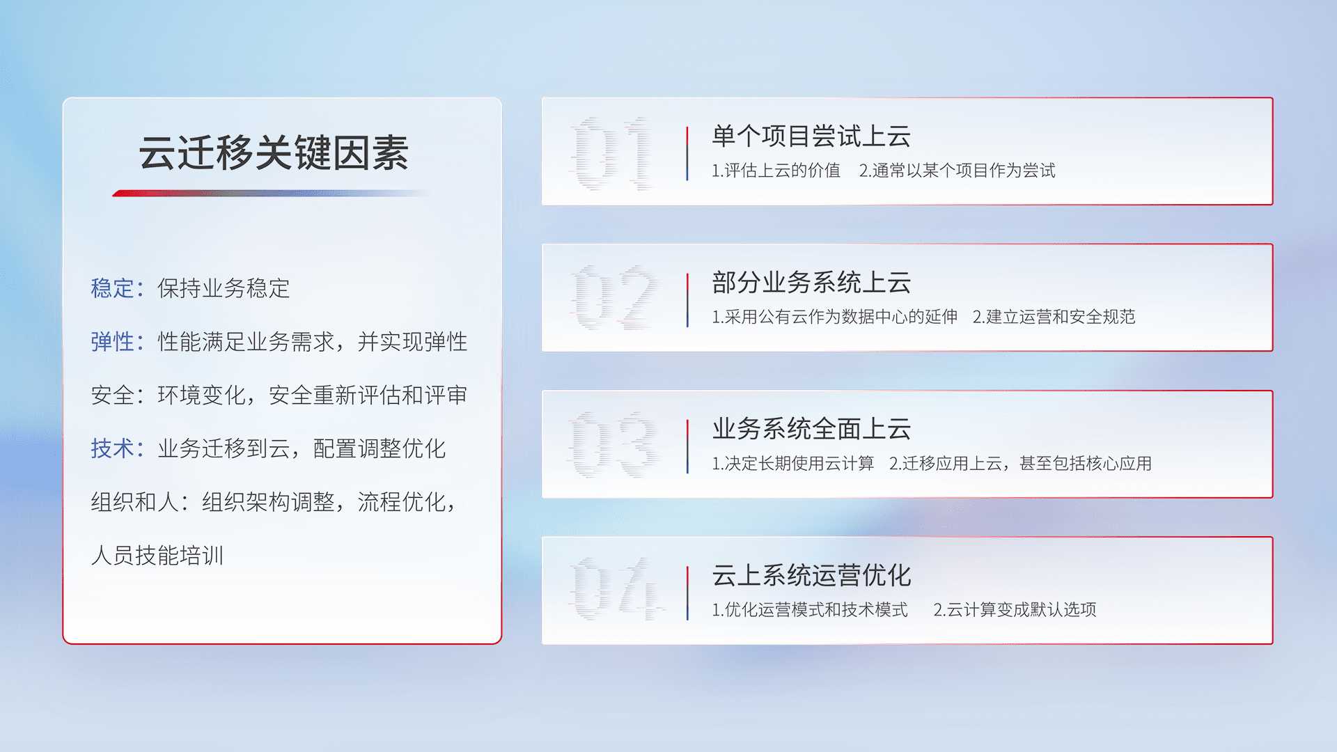 结合实际业务,,从规划设计、、、、云平台选型、、、云原生改造、、、数据迁移、、、、集成交付,,,迁移全过程为客户识别最佳上云路径,,,做好风险识别管理,,,设计网络架构、、、身份权限、、安全审计合规、、、、操作审计、、、、日志审计、、监控告警策略、、、、多站点容灾设计等,,,,对云上基础设施进行整体规划,,提升IT治理水平,,以满足弹性、、高可用、、、高性能的需求。。