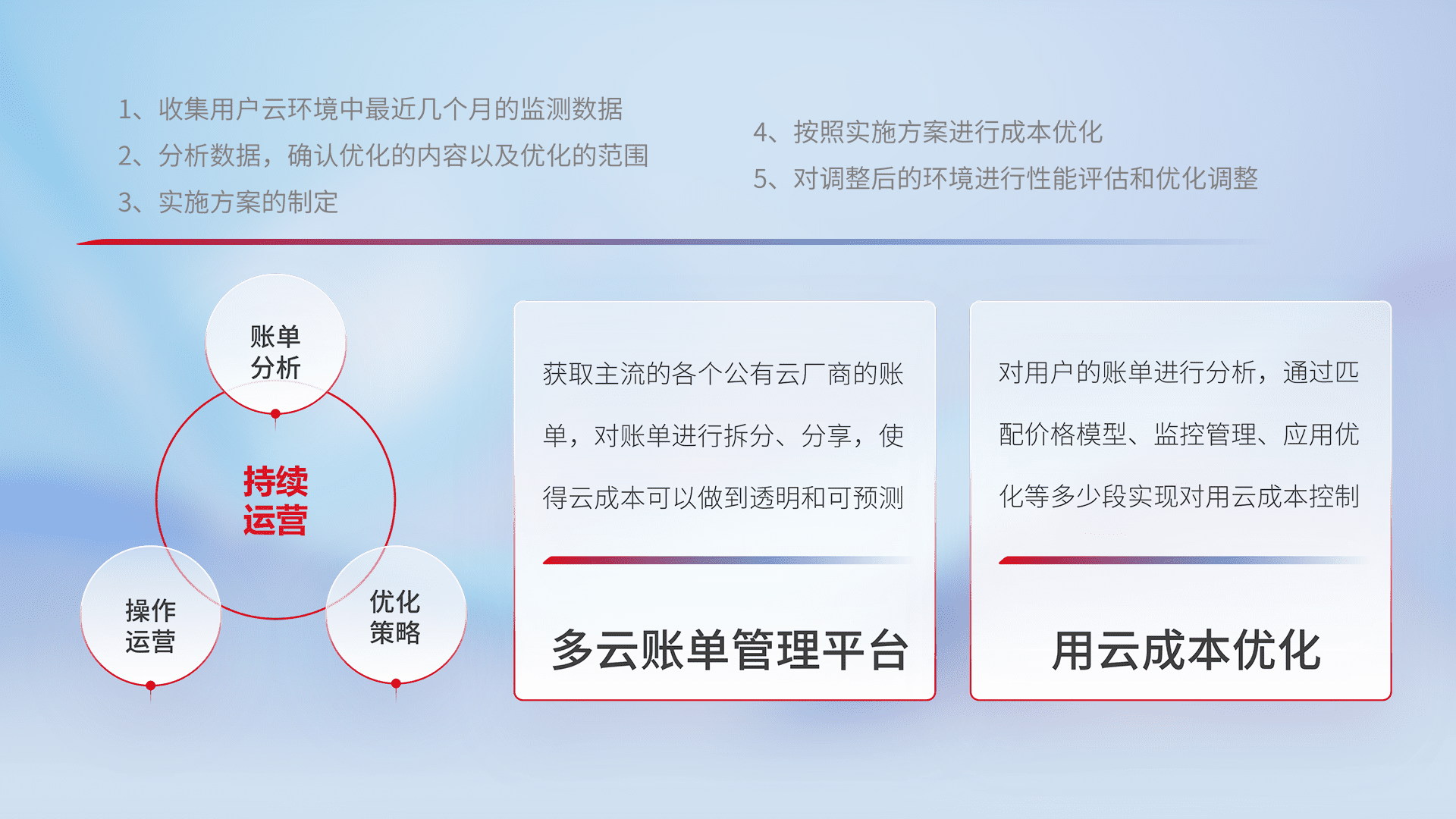 通过多云纳管,,,,以统一的资源数据模型把客户的云资源进行抽象和封装,,进而实现对多云资源的统一操作,,,保障云资源管理的可靠性、、、稳定性与可用性。。量身定制化运维内容,,,配置、、、、开发运维、、、补丁管理、、、、备份、、监控、、、认证和访问管理、、审计和日常巡检等,,,保障在用云过程中的可靠度,,,,稳定度以及高可用率。。。。